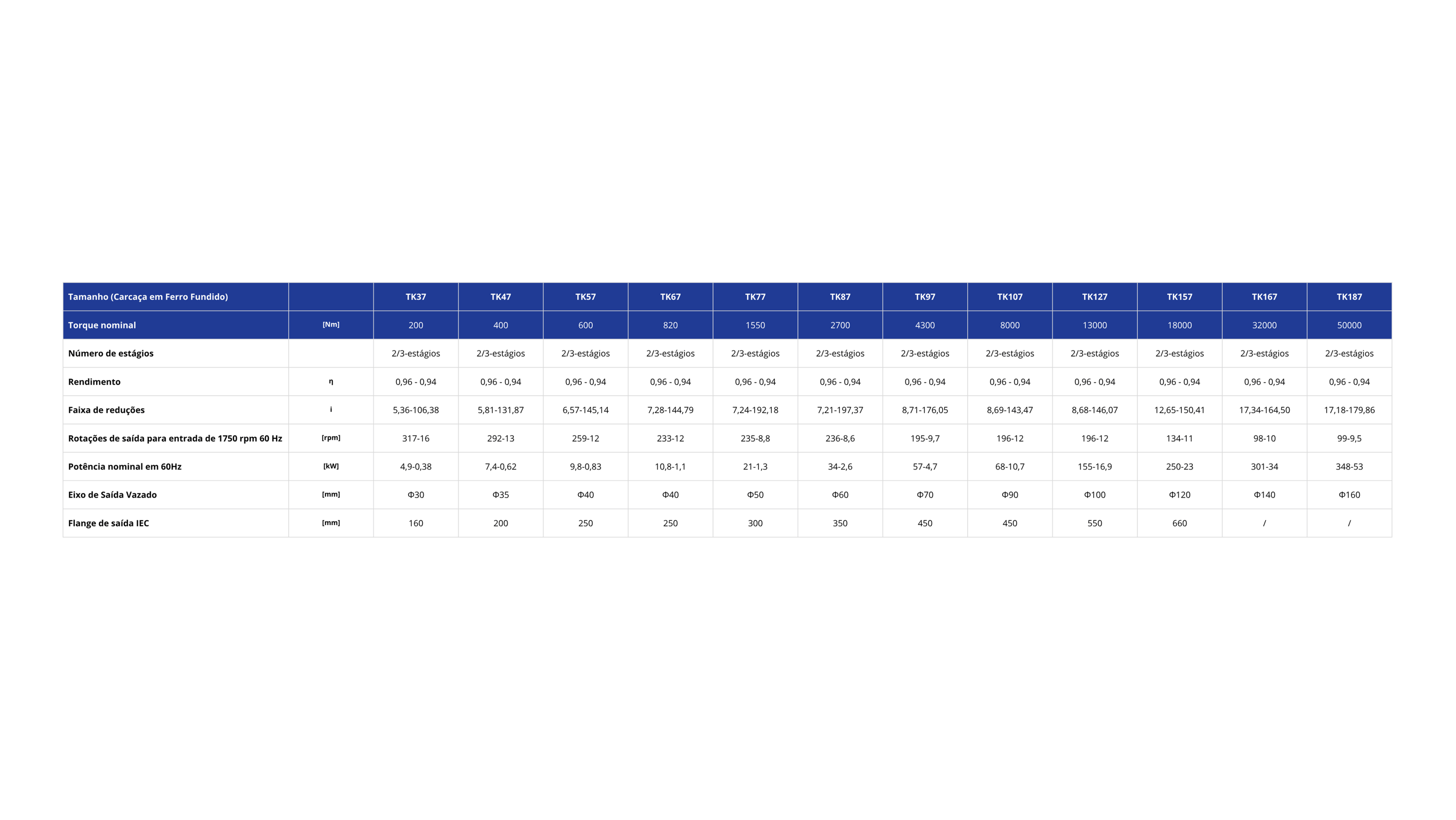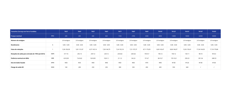 A linha de redutores cônicos modelo TK possuem sua carcaça fabricada em ferro fundido para garantir a robustez necessária para suportar grandes esforços e transferir torques elevados. Além disso, podem ser fornecidos com 2 ou 3 estágios de engrenagens helicoidais cônicas a 90º todas temperadas e retificadas. Os acessórios de fixação como pés, flanges de saída, braço de torção e eixos de saída simples e duplos, proporcionam diversas opções de montagem nas máquinas e equipamentos.