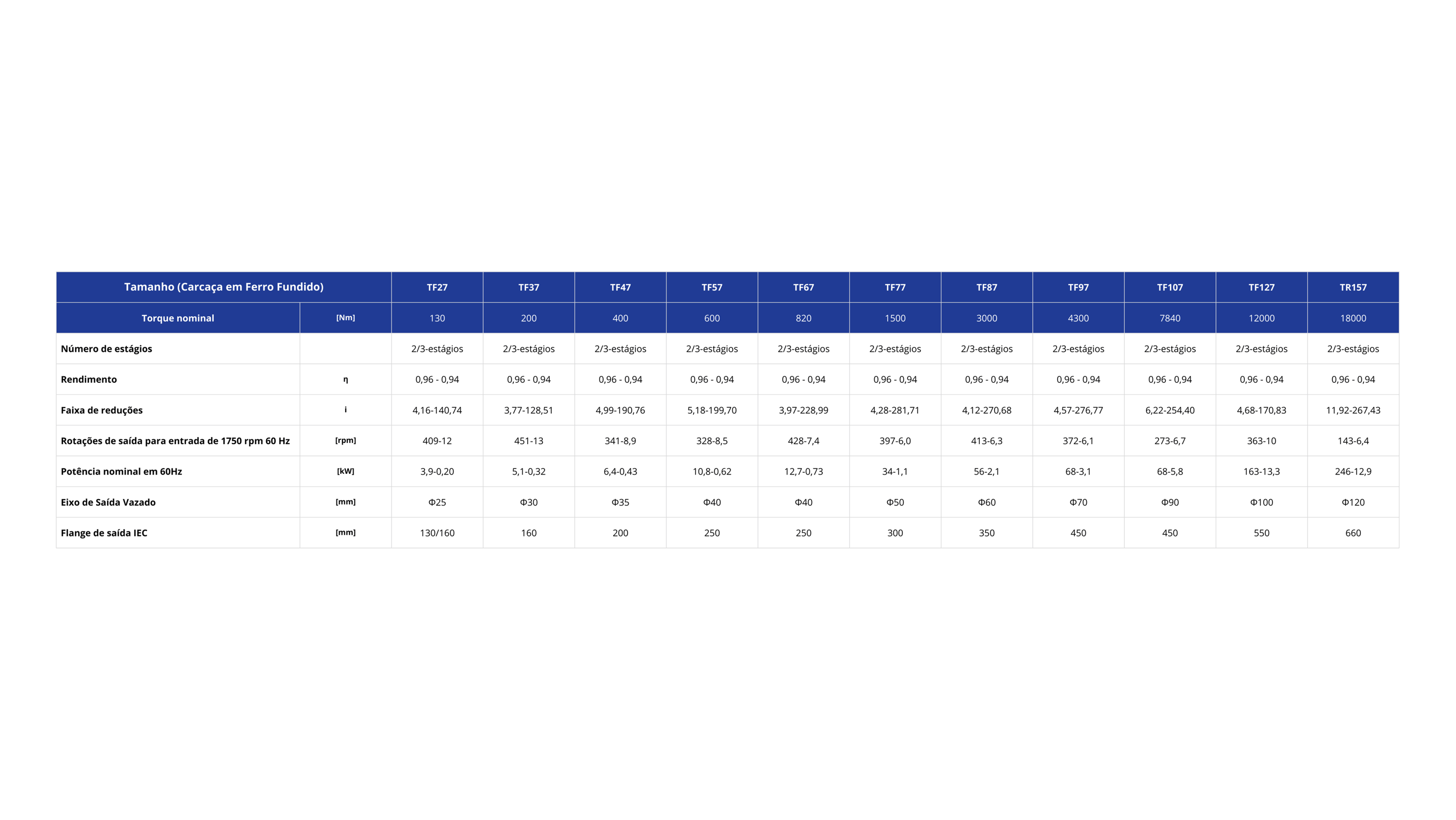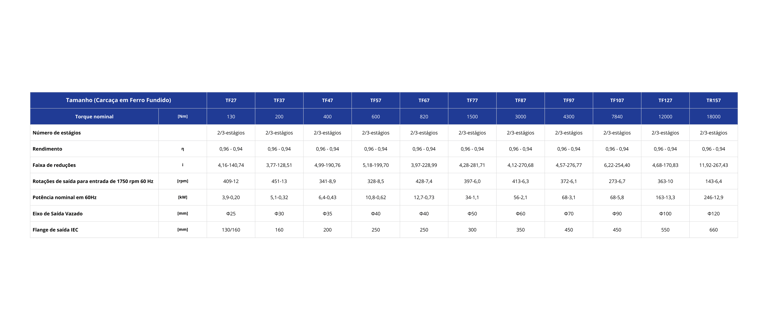 Os redutores paralelos do modelo TF são projetados com carcaça em ferro fundido, garantindo a robustez necessária para suportar grandes esforços e transferir torques elevados. Disponíveis com 2 ou 3 estágios de engrenagens helicoidais, esses redutores oferecem diversas alternativas de montagem, graças aos acessórios de fixação como pés, flanges de saída, braço de torção e eixos de saída simples ou duplos. As combinações dessas características permitem variadas opções de reduções e um rendimento elevado. Além disso, os redutores TF suportam uma ampla gama de potências, variando de 130 Nm a 18.000 Nm. Destacando-se pela versatilidade, são uma excelente escolha para montagem em espaços reduzidos.