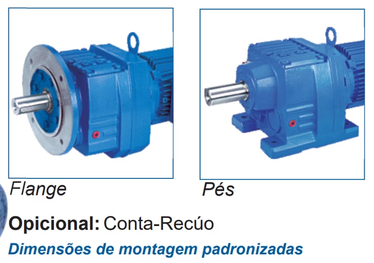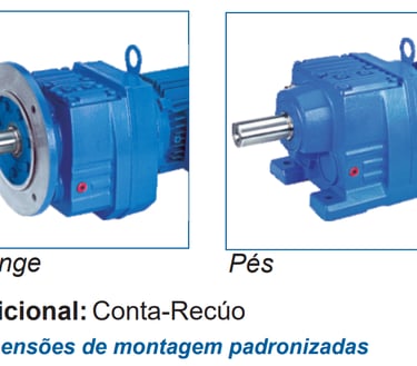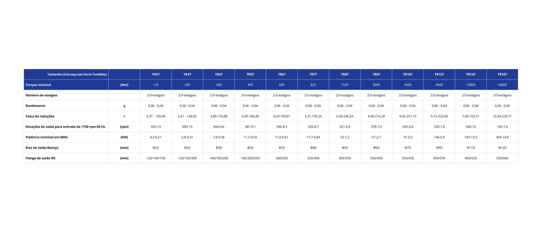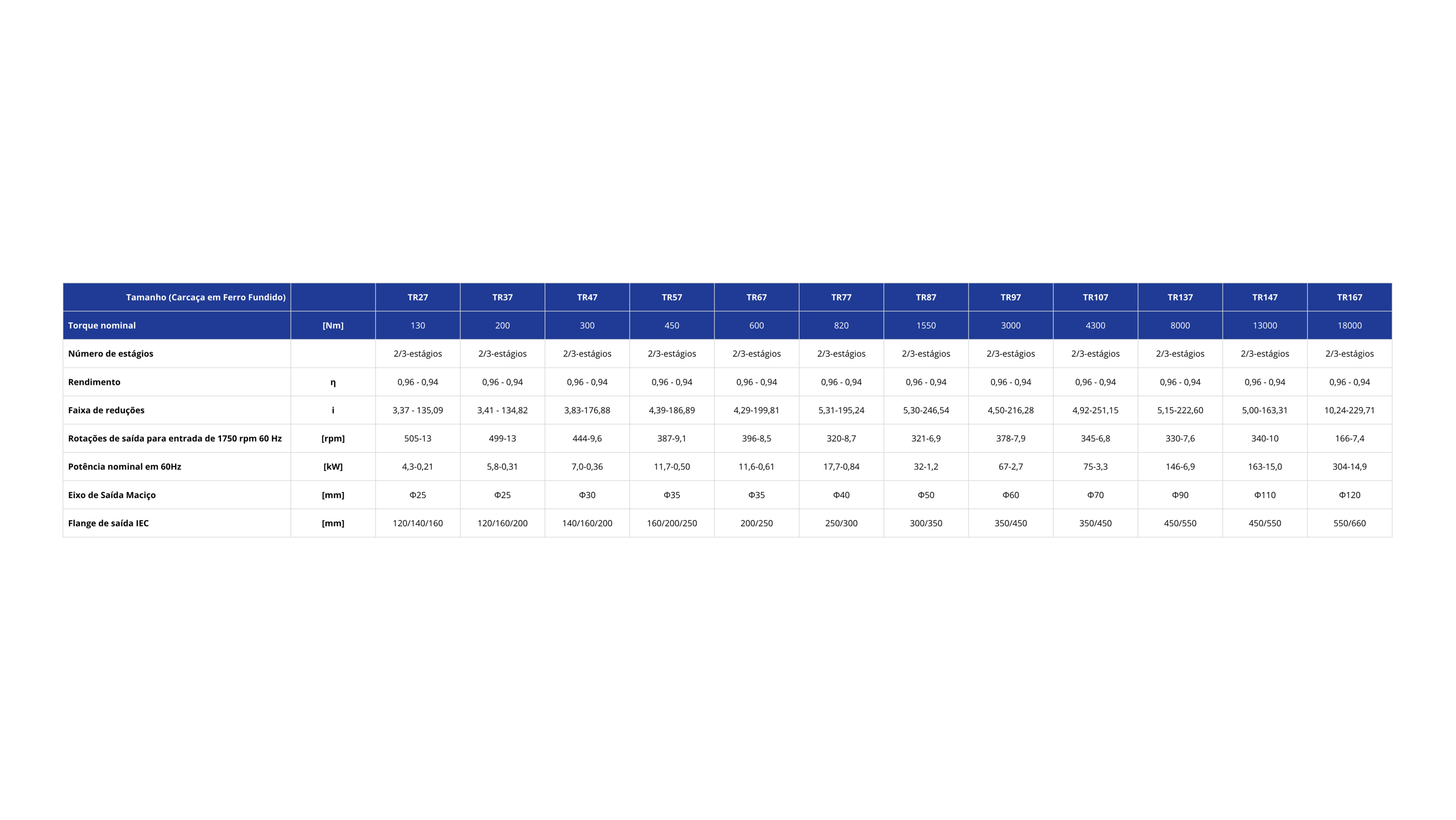 A linha de redutores coaxiais modelo TR possui sua carcaça fabricada em ferro fundido para garantir a robustez necessária para suportar grandes esforços e transferir torques elevados. Além disso, podem ser fornecidos com 2 ou 3 estágios de engrenagens cilíndricas helicoidais coaxiais todas temperadas e retificadas. São fornecidos com 3 formas construtivas com pés (TR), flanges (TRF) e com pés e flange (TR_ _F), flange padrão IEC. Fornecidos com eixo de saída maciço.